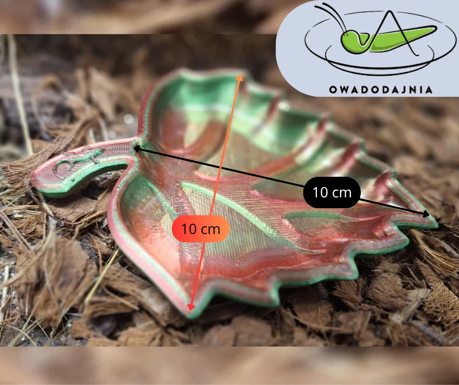 Miseczka terrarystyczna wykonana w technologii druku 3D, zabezpieczona żywicą, łączy funkcję użytkową z dekoracyjną. Doskonale sprawdzi się jako poidełko lub miejsce na owoce dla gadów, a jej forma inspirowana naturą subtelnie podkreśla charakter każdego terrarium. Dodatkowym detalem jest motyw jaszczurki umieszczony na ogonku liścia, nawiązujący do tematyki egzotycznej.