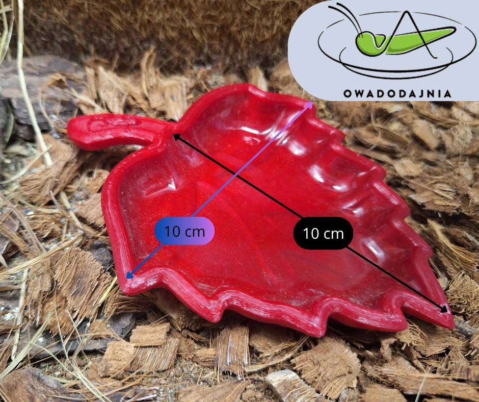 Miseczka terrarystyczna wykonana w technologii druku 3D, zabezpieczona żywicą, łączy funkcję użytkową z dekoracyjną. Doskonale sprawdzi się jako poidełko lub miejsce na owoce dla gadów, a jej forma inspirowana naturą subtelnie podkreśla charakter każdego terrarium. Dodatkowym detalem jest motyw jaszczurki umieszczony na ogonku liścia, nawiązujący do tematyki egzotycznej.