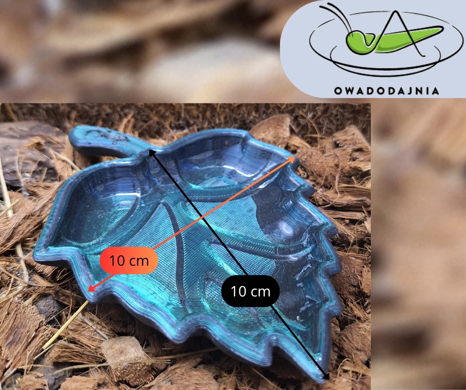 Miseczka terrarystyczna wykonana w technologii druku 3D, zabezpieczona żywicą, łączy funkcję użytkową z dekoracyjną. Doskonale sprawdzi się jako poidełko lub miejsce na owoce dla gadów, a jej forma inspirowana naturą subtelnie podkreśla charakter każdego terrarium. Dodatkowym detalem jest motyw jaszczurki umieszczony na ogonku liścia, nawiązujący do tematyki egzotycznej.