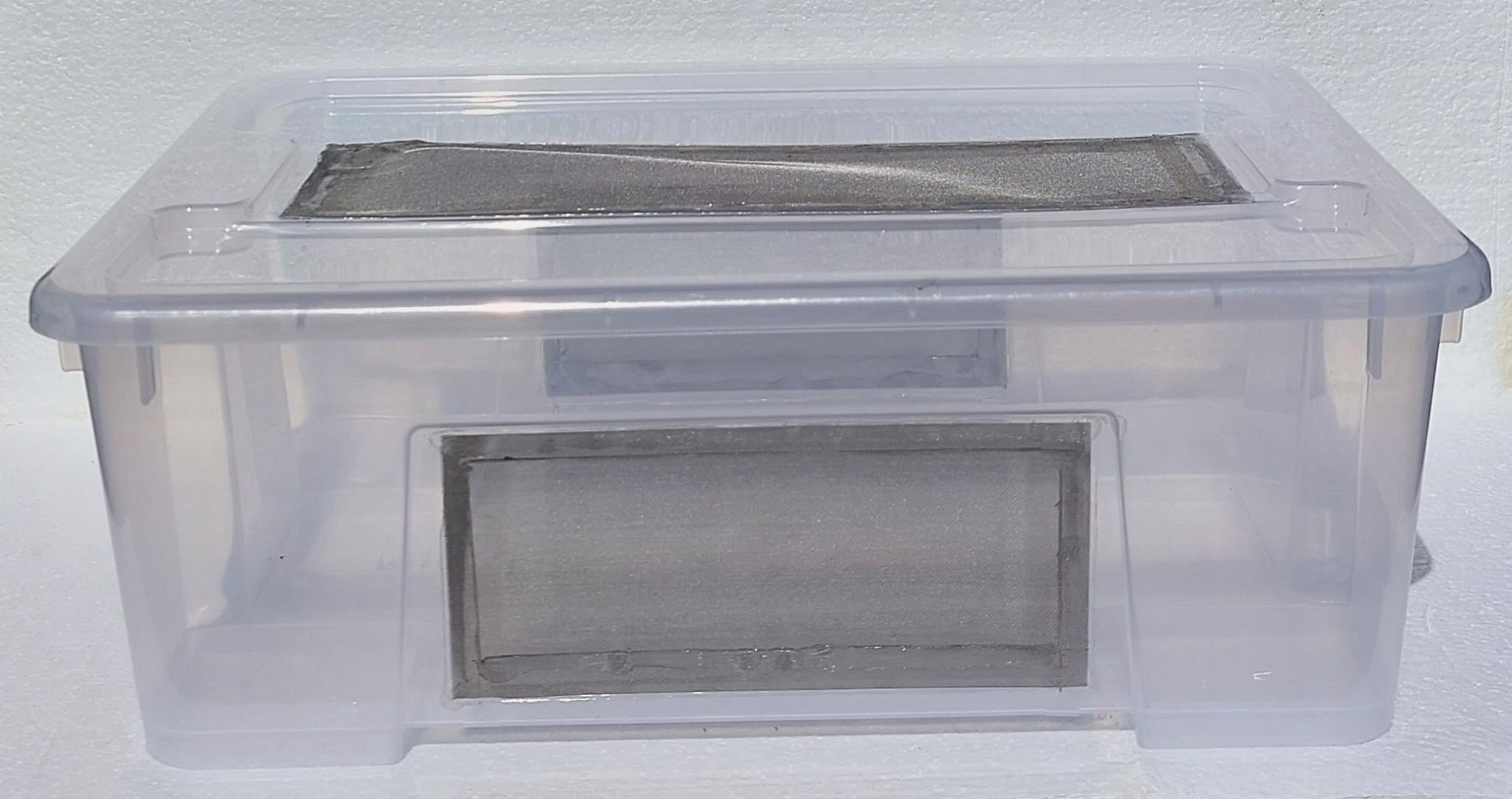 Pojemnik hodowlany 11l z pokrywką przystosowany dla karaczanów lub larw. Zawiera wentylację wykorzystującą naturalną cyrkulację powietrza. Wykonany z wytrzymałego tworzywa, z wgrzaną drobną siatką, która nie pozwoli na wyjście nawet bardzo drobnej karmówki.